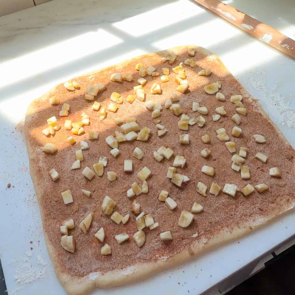 Banana Bread Cinnamon Roll dough with cinnamon sugar and diced banana.Banana Bread Cinnamon Roll dough with cinnamon sugar and diced banana.