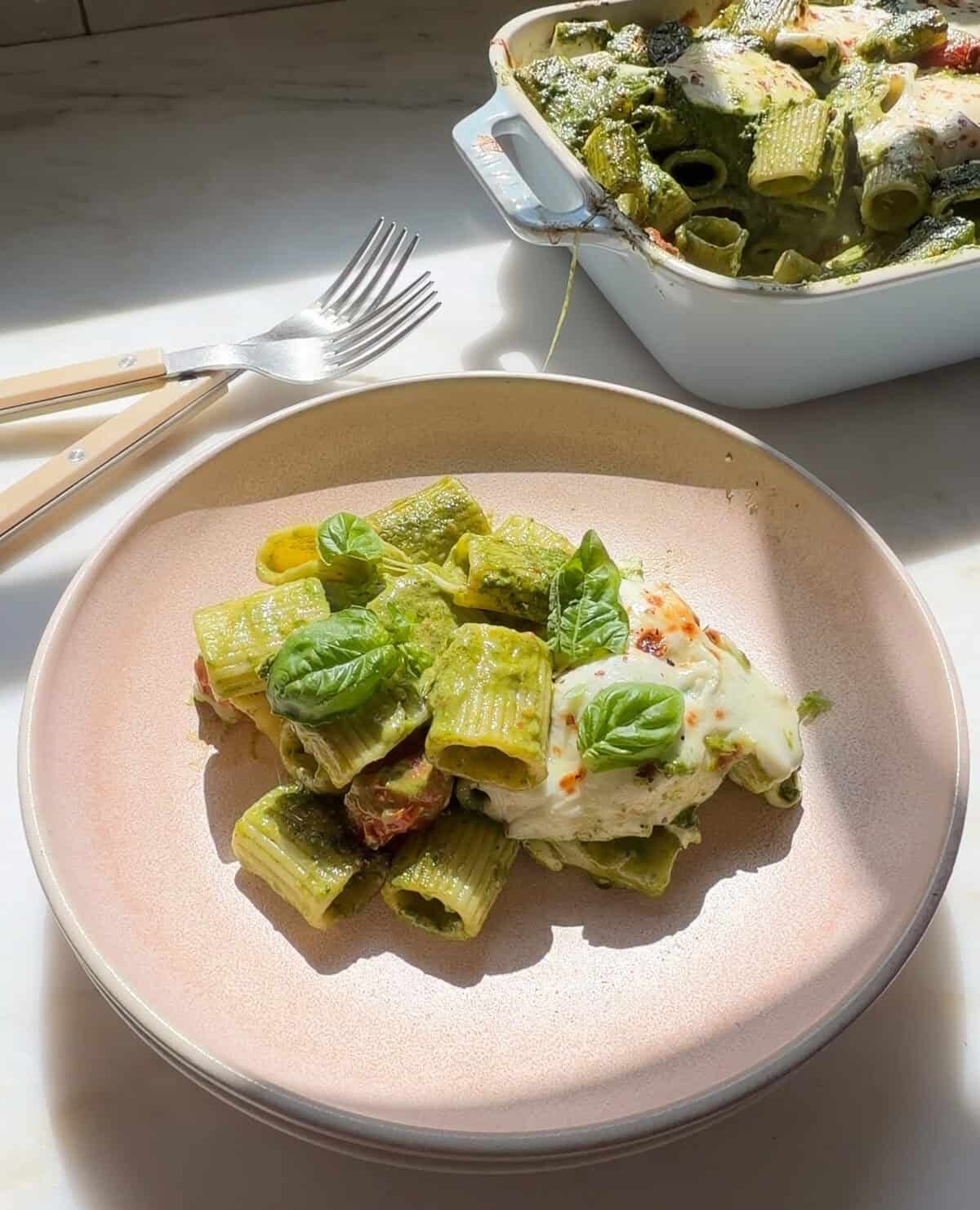 Pesto Pasta Bake in a bowl.Pesto Pasta Bake in a bowl.