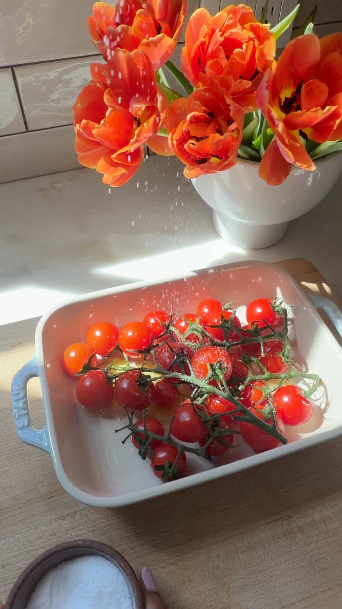 Cherry tomatoes with salt and olive oil in baking dish.Cherry tomatoes with salt and olive oil in baking dish.