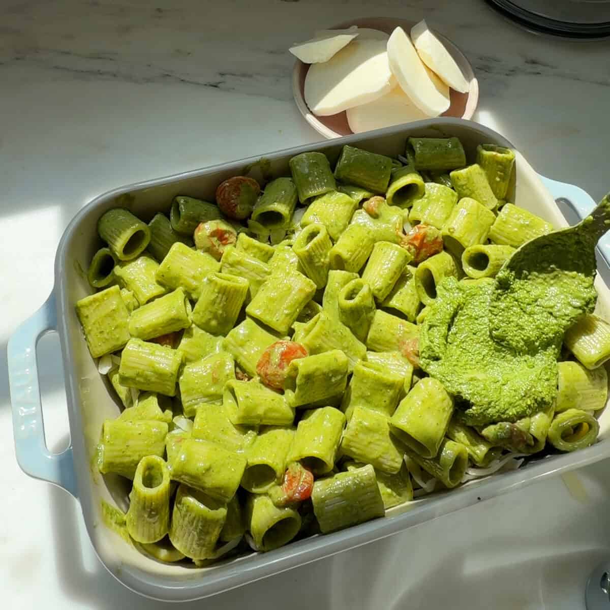 • Add a layer of the pesto pasta to a 9×13-inch casserole dish, then sprinkle on the shredded mozzarella, then add the rest of the pesto pasta. Dollop the reserved pesto on top. Then cover the top with slices of mozzarella cheese. Bake covered for 20 minutes then broil uncovered for 3 minutes until cheese is melted with golden brown flecks.
