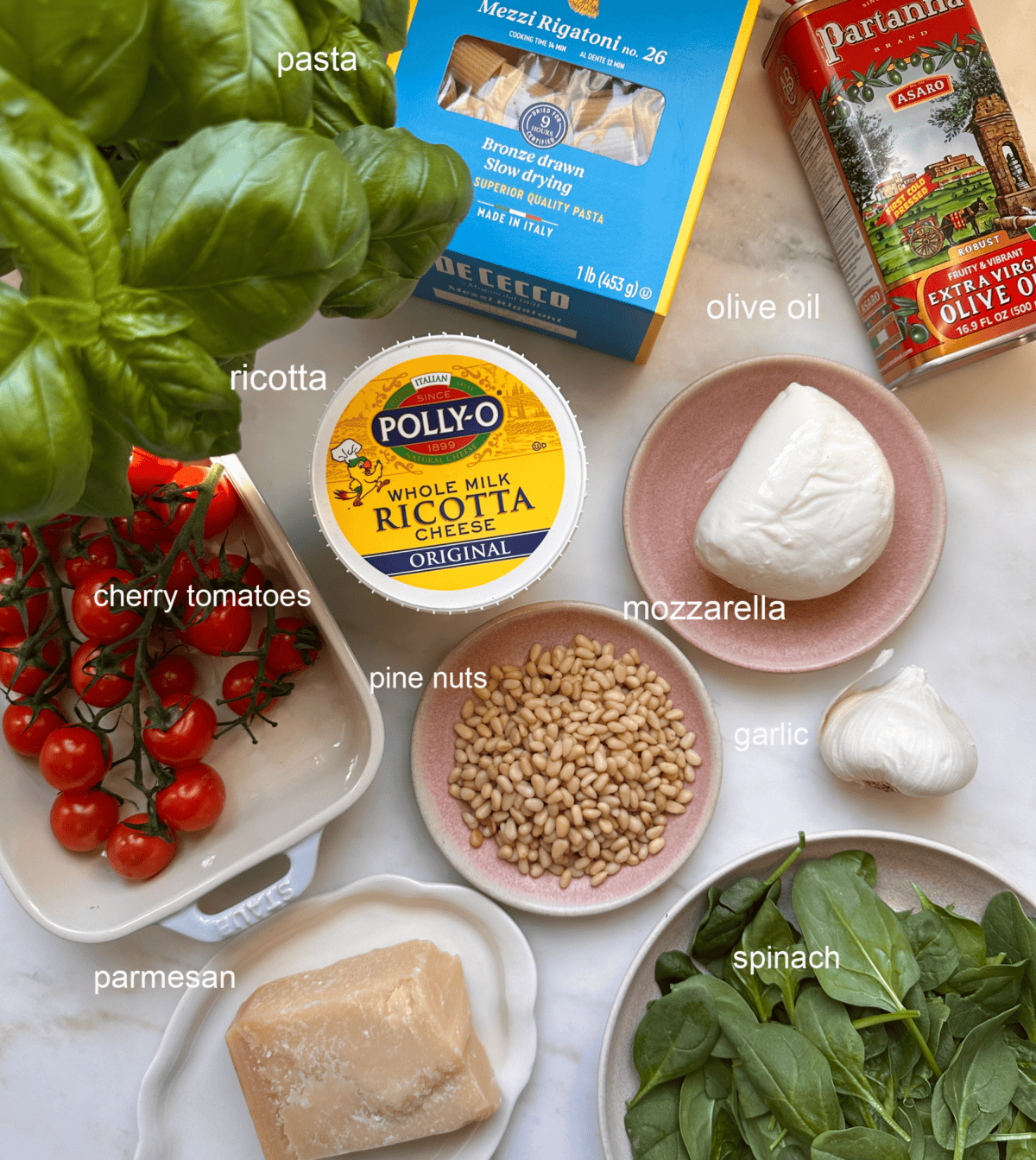 Pesto pasta bake ingredients.Pesto pasta bake ingredients.