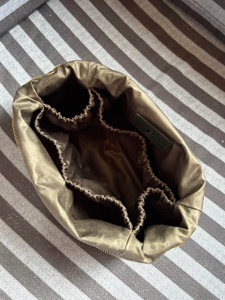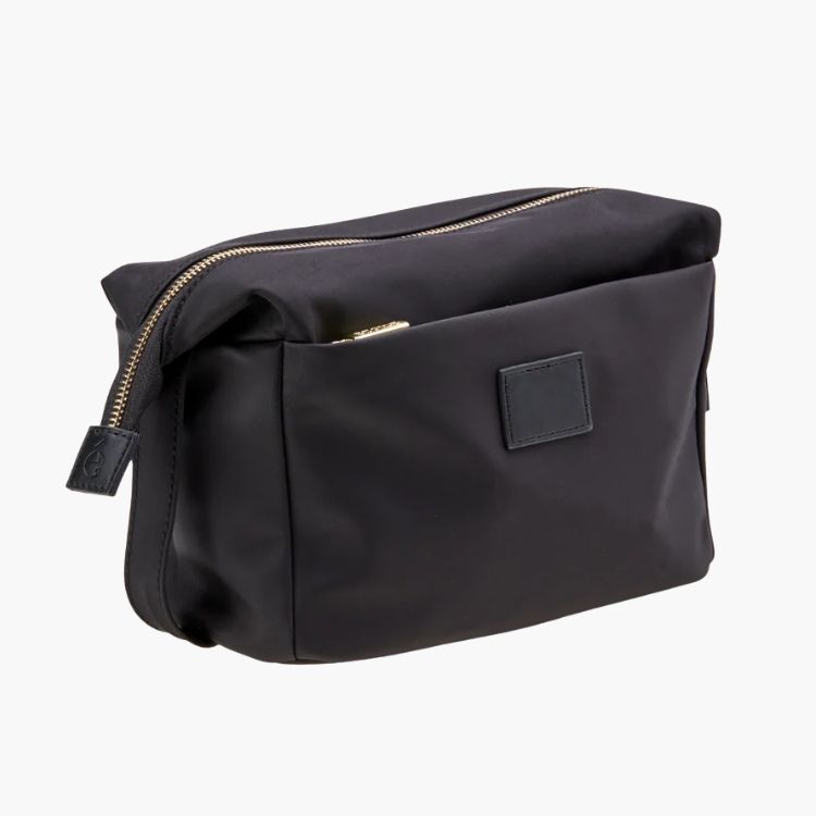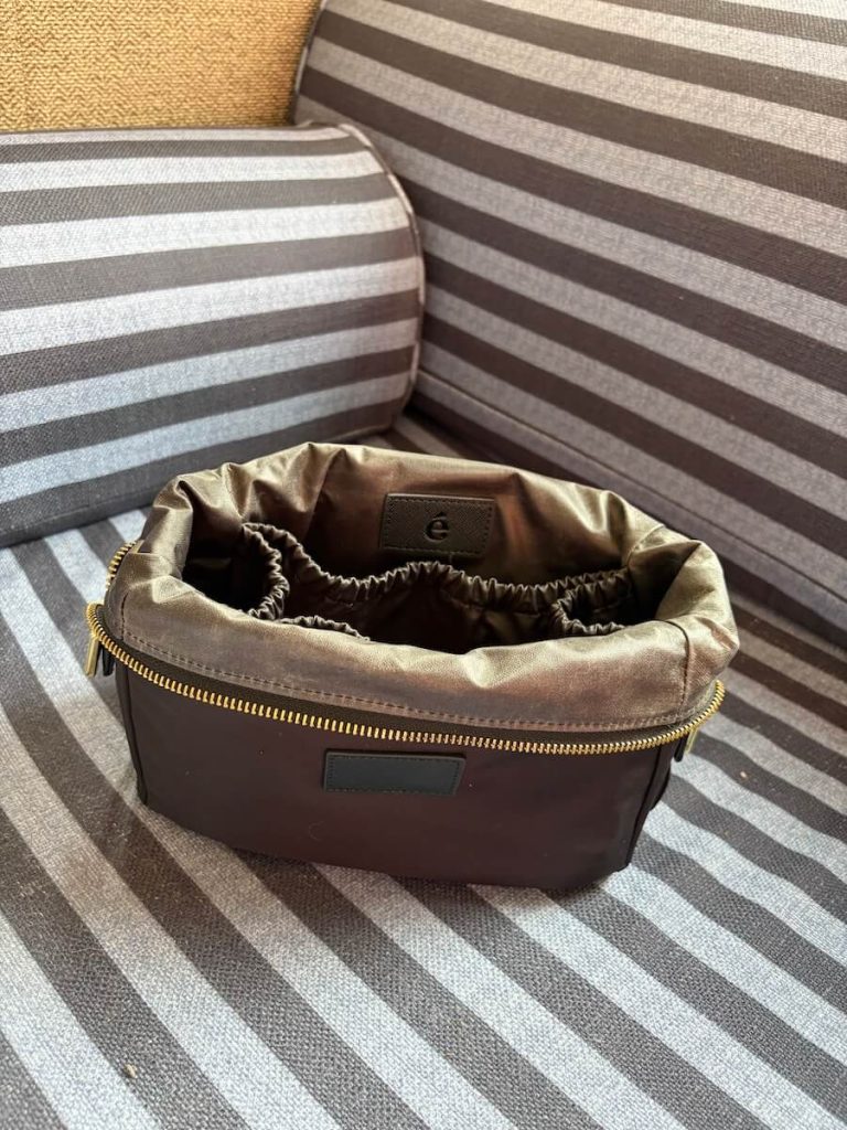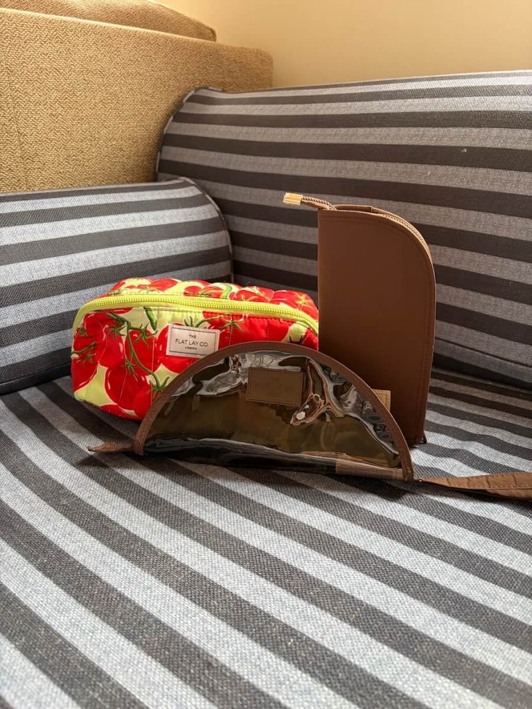 This bag is my go-to for a trip that requires me to pack more minimally. It fits super easily into a carry-on, and allows me to keep skincare on one side and haircare on the other (packing my makeup separately). The zipper pouches on the inside are a sturdy plastic-y material that’s incredibly easy to clean.